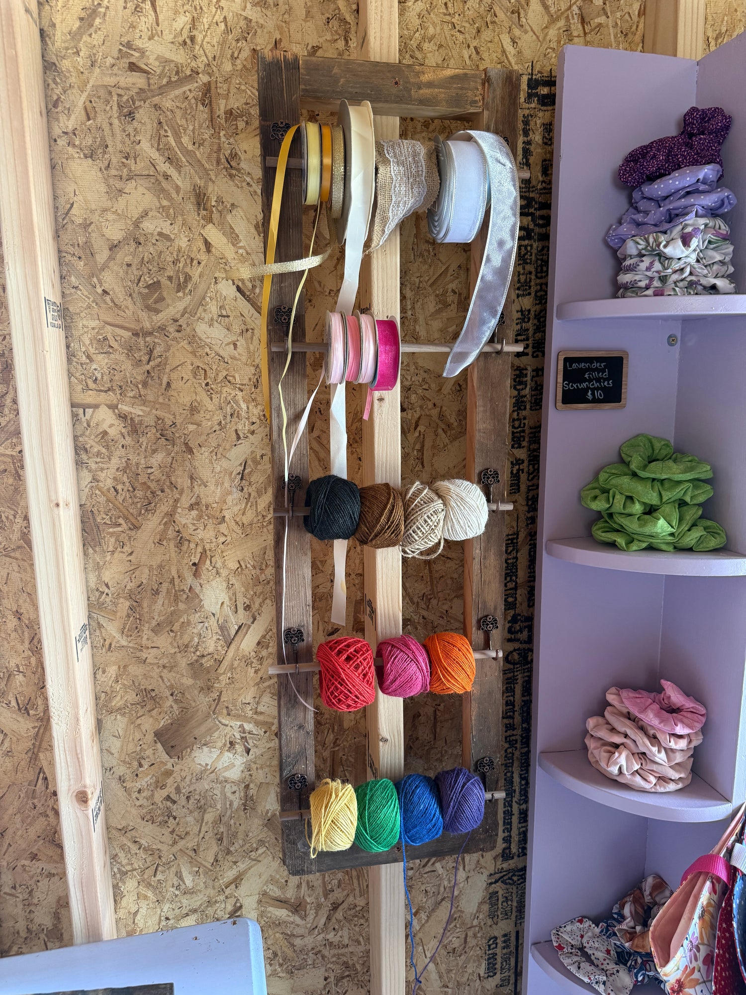 Most of the furniture inside has been thoughtfully refinished and painted by hand, giving each piece a story and charm all its own. Some of the shelves were rescued and repurposed from our local Habitat for Humanity ReStore, adding a special touch of sustainability and character. With the help of my dad and husband, many of my visions for the space became reality—they poured their time and talent into making this store feel warm, welcoming, and uniquely ours. They refinished an old dresser into a check out stand with pallets, covered the sewing machine turned desk, and made the ribbon holders!